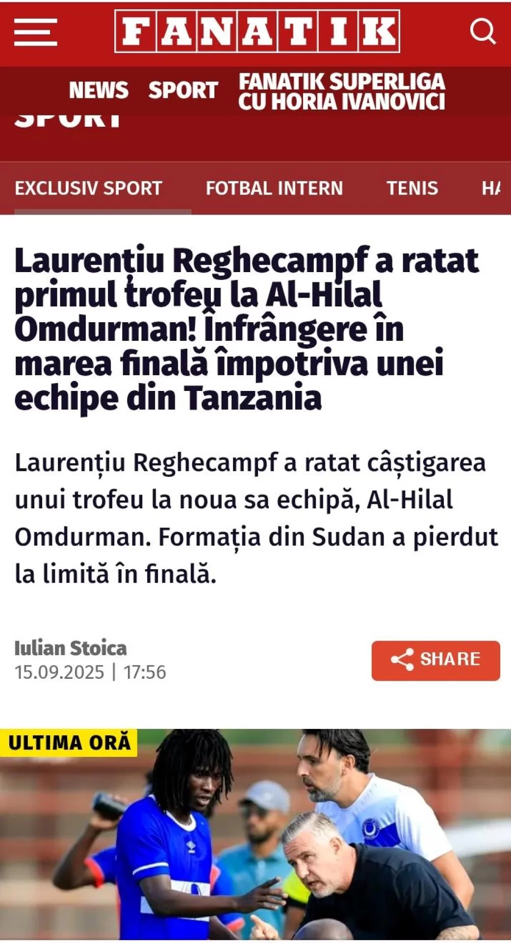 "ضاعت البطولة الأولى.. ريجكامب يخسر" ، تحت هذا العنوان اهتم موقع ديجي سبورت الروماني، بخسارة الهلال أمس أمام سيجيندا التنزاني في نهائي سيكافا، واعتبر أن الفريق لم يجد الفرصة لتكرار الأداء الملحمي في مباراة الجيش الرواندي.